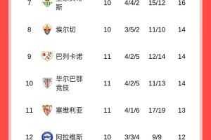 西甲积分榜:皇马11轮10胜暂7分优势领跑,巴萨第三明日出战